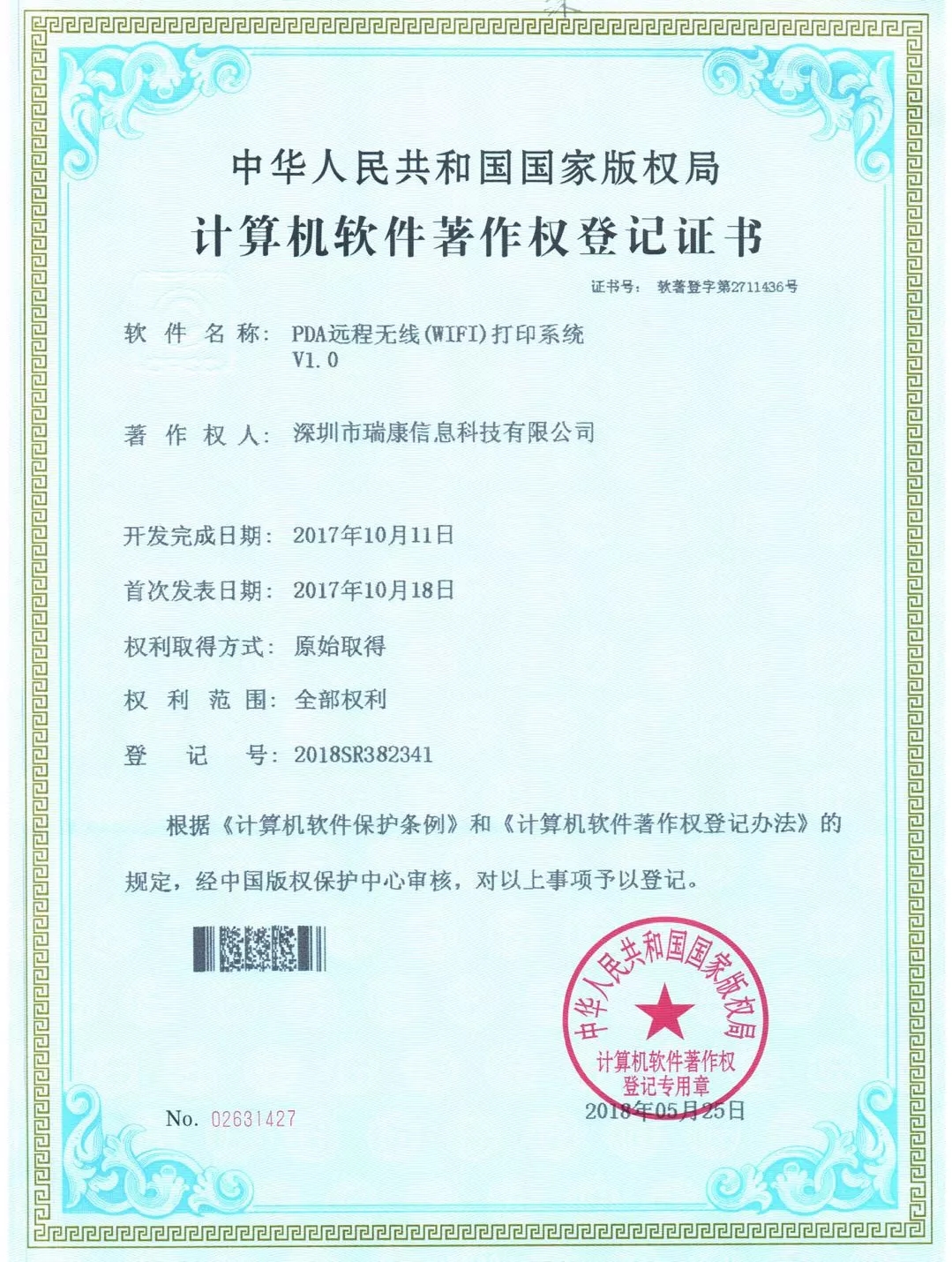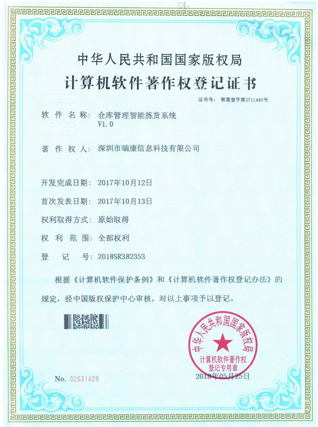 本次由我司獨立研發的《倉庫管理智能揀貨系統V1.0》、《PDA遠程無線(WIFI)打印系統V1.0》經中華人民共和國國家版權局考證,被認定為這兩個軟件的法定著作權人,從頒證之日起,其版權將得到中國版權保護中心的有效保護。