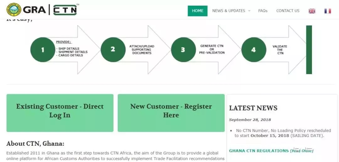 發貨人/承運人需在官網https://www.ctnghana.com/上傳以下文件:商業發票、出口報關單掃描件(符合要求的報關預錄單也可以)、裝箱單,24-36個小時內會得到一個未生效的CTN號碼。